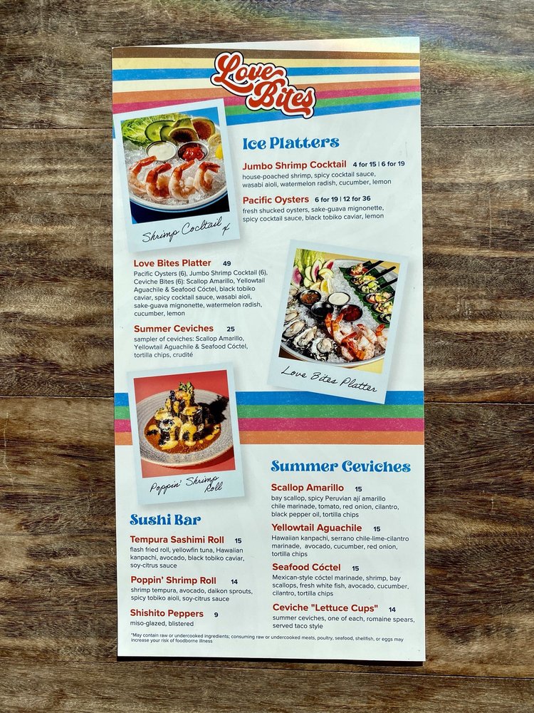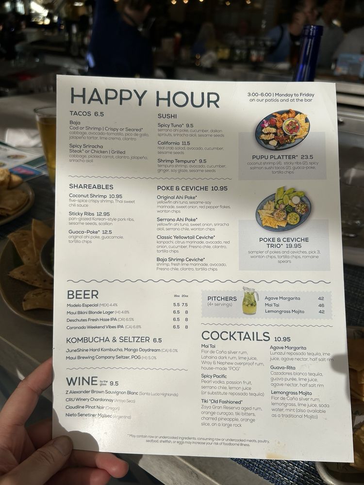 NEW! coconut shrimp (4), sticky ribs (2), spicy salmon sushi tacos (2), guaca-poke, tortilla chips